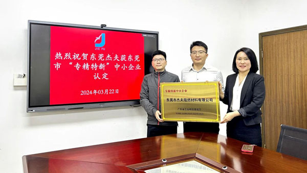 3月22日,東莞市“專精特新”企業(yè)聯(lián)合會一行來東莞杰夫阻燃材料有限公司開展“企業(yè)授牌及走訪調(diào)研”并舉行授牌儀式,東莞杰夫總經(jīng)辦主任李康、財務(wù)經(jīng)理封東弟參加授牌儀式,并與專精特新企業(yè)聯(lián)合會就政策支持、開展市場拓展、產(chǎn)業(yè)鏈上下游對接合作,提供技術(shù)咨詢及產(chǎn)學研合作,搭建融資橋梁解決融資難題展開了深入的交流。
