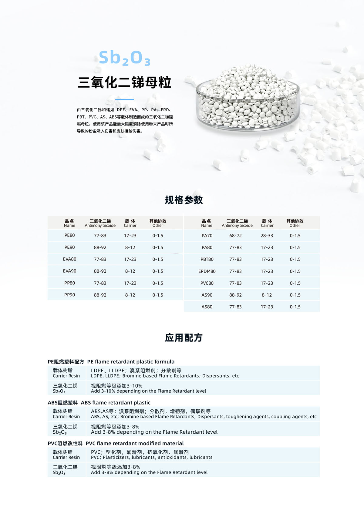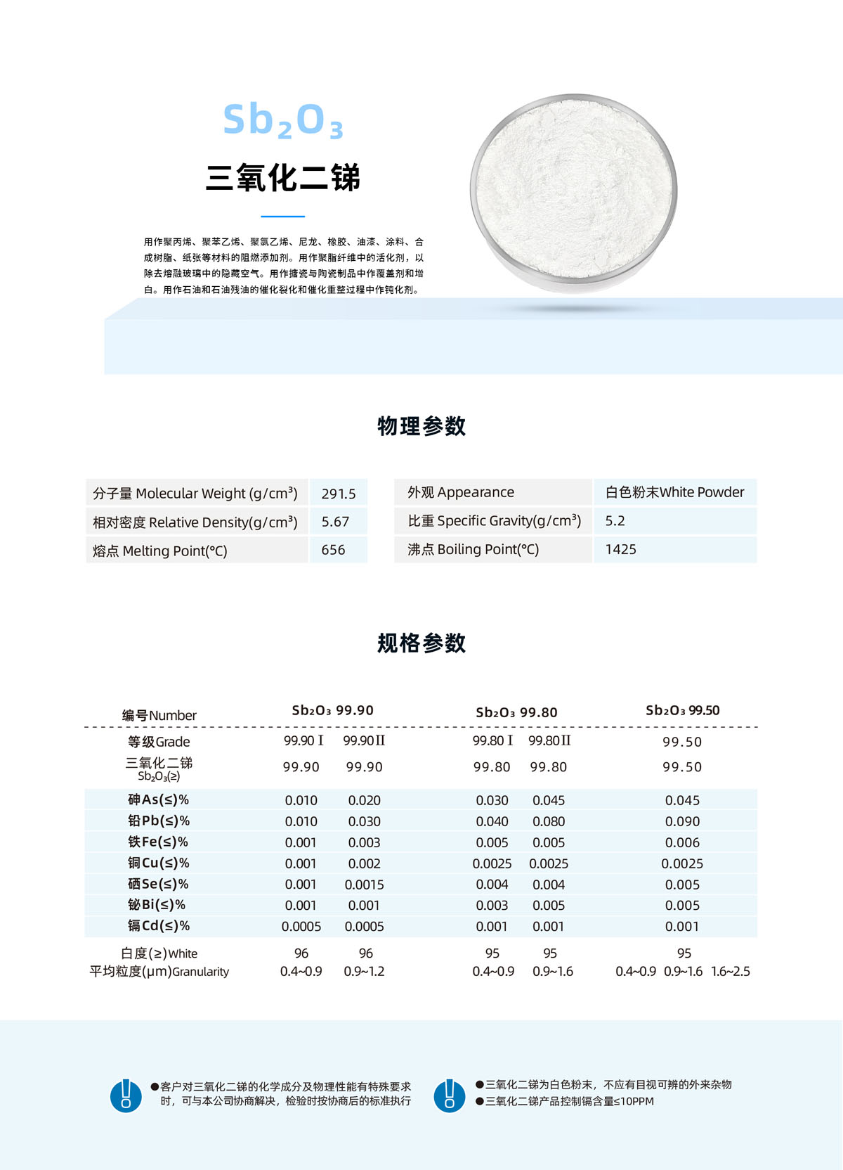 用作塑料、橡膠、油漆、涂料、合成樹脂、紡織、化纖等材料的阻燃添加劑。用于光伏玻璃的澄清劑,以除去熔融玻璃中的隱藏空氣。用作聚酯PET合成縮聚反應(yīng)的催化劑;用作石油催化裂化和催化重整過程中的鈍化劑。用作搪瓷與陶瓷制品中作覆蓋劑和增白。