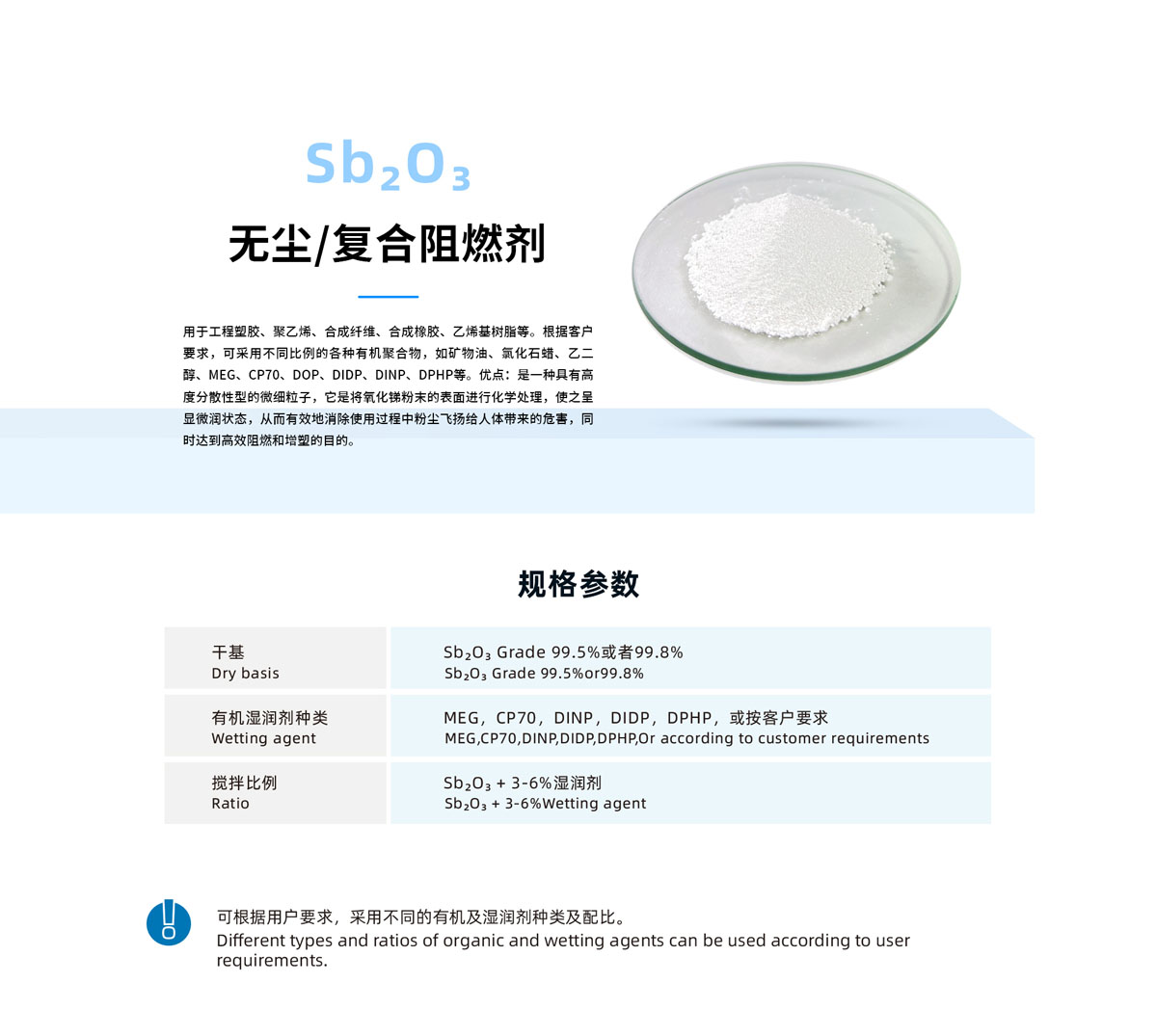 一種具有高度分散性型的微細(xì)粒子,它是將氧化銻粉末的表面、進(jìn)行化學(xué)處理,使之呈顯微潤狀態(tài),從而有效地消除使用過程中粉塵飛揚(yáng)給人體帶來的危害,同時(shí)達(dá)到高效阻燃和增塑的目的。